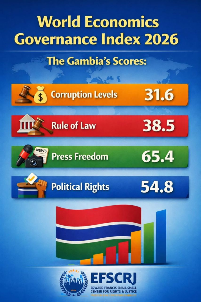 The Edward Francis Small Centre for Rights and Justice has received with grave concern the findings of the World Economics Governance Index 2026 regarding the Gambia’s governance performance. The report evaluates governance across four core indicators: corruption perception, rule of law, press freedom, and political rights, measured on a scale of 0 to 100. The Gambia’s overall score stands at 47.6, earning the country a Grade C (Average).